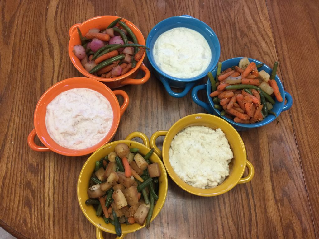 From left to right: orange bowl: Mashed radishes. Orange bowl: Cubed radishes. Blue bowl: Mashed parsnips. Blue bowl: Cubed parsnips. Yellow bowl: Mashed turnips. Yellow bowl: Cubed turnips.