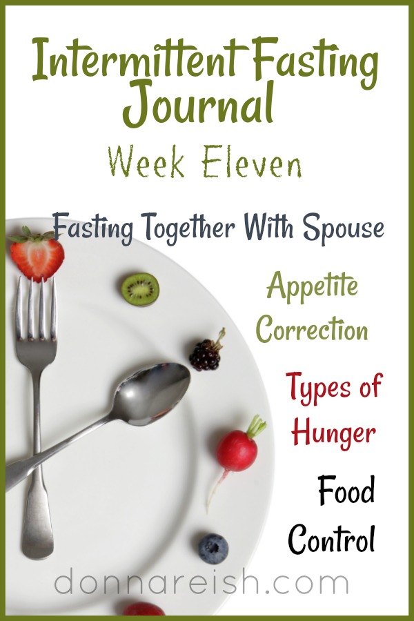 It’s Week 11/Episode 11 of The Intermittent Fasting Journal! New Year’s Week—and Donna’s hubby is on board too! Yay them! In this episode, Donna gives her week eleven findings and results, including losing weight slowly and steadily during holidays and enjoying a traditional New Year’s Day dinner. She reviews the coping mechanisms of self talk, five second rule, having an earlier eating window that ends by seven each day (and how this benefits her), using the app, and more. Donna goes into detail about her lifestyle with her husband, Ray Baby, who has lost ten pounds in three weeks on his IF plan! She describes husbands and wives planning and fasting together and how much she and Ray enjoy eating out together now as empty nesting fasters. She was encouraged by going into a new year with no deadlines and no drastic weight loss plans in place and explains how to make Daily IF a lifestyle rather than a frantic new year weight loss goal. No time limits! Donna then teaches from AC: The Power of Appetite Correction by Bert Herring with the six kinds of hunger: (1) Appestat–real hunger; (2) Somatic hunger–sensation in the belly; (3) Limbic hunger–drive to continue eating once you’re full; (4) Clock hunger–biological clock–hunger striking 23-24 hours from when you ate last; (5) Appetite-driven hunger–when you visualize yourself eating something; (6) Mouth hunger–urge to chew on something when you’re not really hungry. She ends the main section with how she has finally achieved control over areas of her life that had eluded her even when she had 32 years of homeschooling and writing success–food control. Huge win! We can manage every area of our lives when we are successful with Daily Intermittent Fasting!