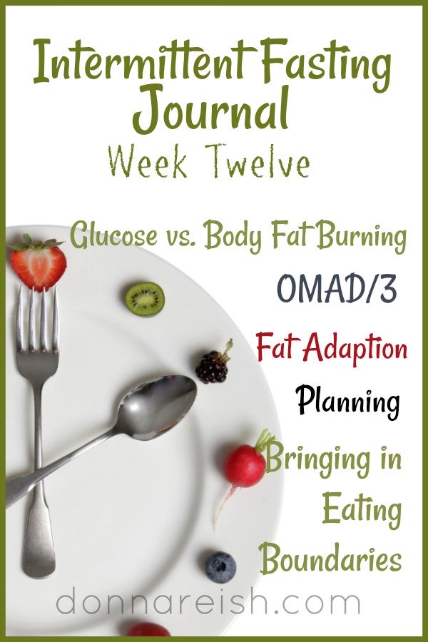 In Episode 12/Week 12, Donna Reish, blogger, recipe creator, and Daily Intermittent Fasting teacher tells about her twelfth week and her husband’s fifth week of Daily IF. She describes the pattern that she has settled in at 19:5, including OMAD/3–One Meal a Day divided into three parts (see outline). She describes what being fat adaptive means, including the differences between glucose/glycogen store burning and body fat burning. Donna teaches the importance of staying the course, including bringing in eating boundaries and not going off and on and making too many “special occasions.” Finally, she describes several things that affect Fat Adaption each day: number of fasting hours, how much glycogen is being stored/circulating glucose is available to use, how long your eating window is, whether you exercise or not, and how many carbs you are consuming. Subscribe to Donna’s YouTube channel; podcast at iTunes; and here at her blog. Join her FB group where she teaches daily about this way of life.