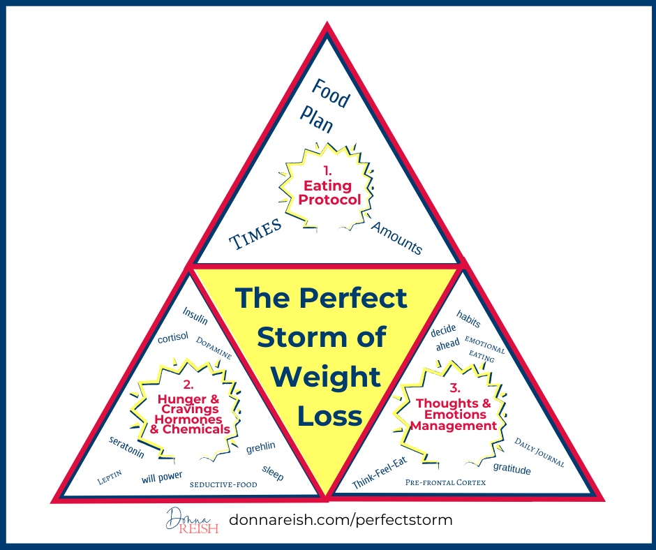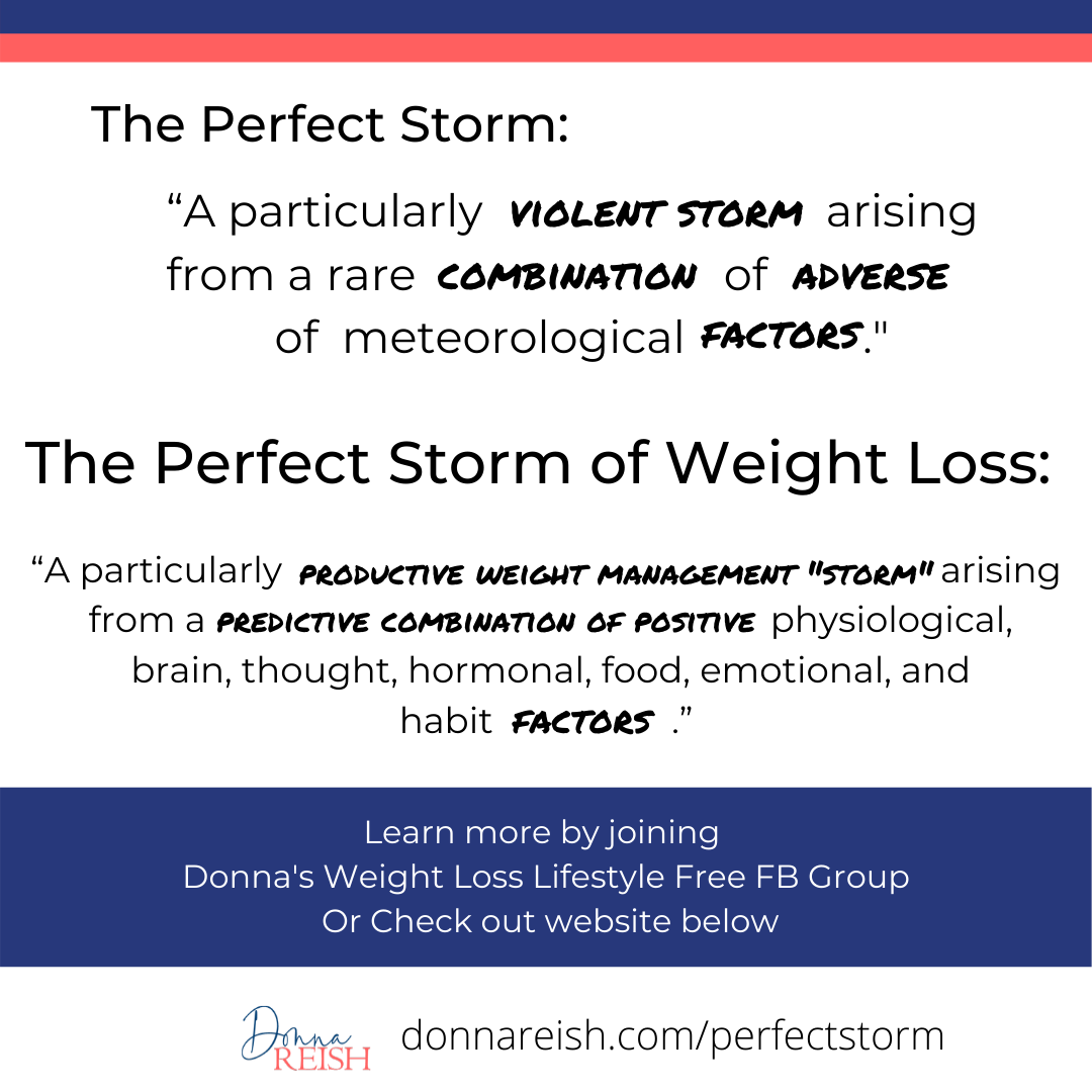 This “Perfect Storm” is the same method I use with my weight loss coaching clients! Set up a consult to see if weight loss/life coaching with me is a good move for you at https://donnareish.com/coach